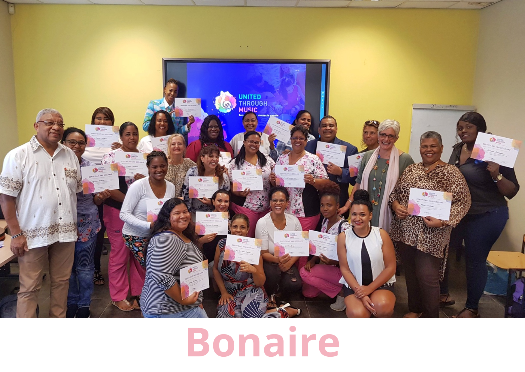 Er worden scholingen en trainingen gegeven in zorginstellingen op Curaçao, Bonaire, Sint-Maarten en andere eilanden in het Caribisch gebied. Deze trainingen zijn toegespitst op zorgverleners en activiteitenbegeleiders die werken met ouderen, mensen met een vorm van dementie, kwetsbare en zorgafhankelijke mensen. De scholing heeft als doel dat de toegevoegde waarde van muziek in het zorgproces wordt geïmplementeerd. De inhoud van de scholing is gericht op het vergoten van de kennis, kunde, vaardigheden, muzikale creativiteit en het delen van ervaringen.